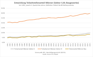 Diese Entwicklungen führten zu einer Zunahme auch des Teilzeitstellenanteils der Männer: Im Dienstleistungssektor (III) stieg der Anteil seit 1991 um 9,1 Prozentpunkte auf 29,7%, im Sektor Bau und Industrie (II) um 4,2 Prozentpunkte auf 9,6%. Im Baugewerbe (Teil des Sektors Bau und Industrie) nahm der Teilzeitstellenanteil der Männer seit 1991 um 3,5 Prozentpunkte auf 8,2% zu.