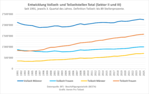 Teilzeitstellen haben in den letzten drei Jahrzehnten stark zugenommen, sowohl bei den Frauen als auch bei den Männern. Seit 1991 wuchsen Teilzeitstellen der Frauen um 89%, jene der Männer um 97%.